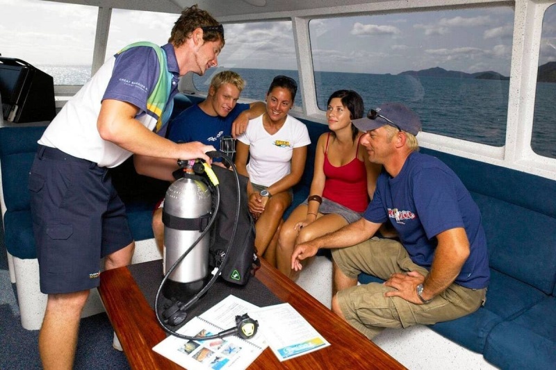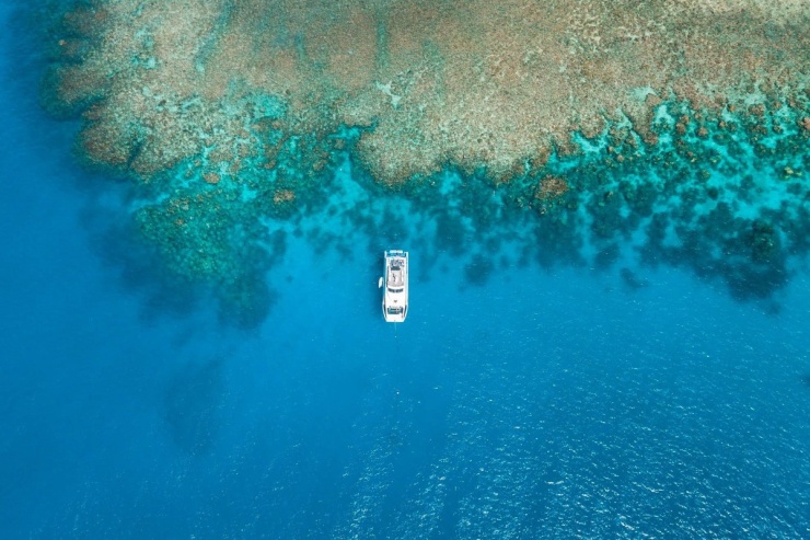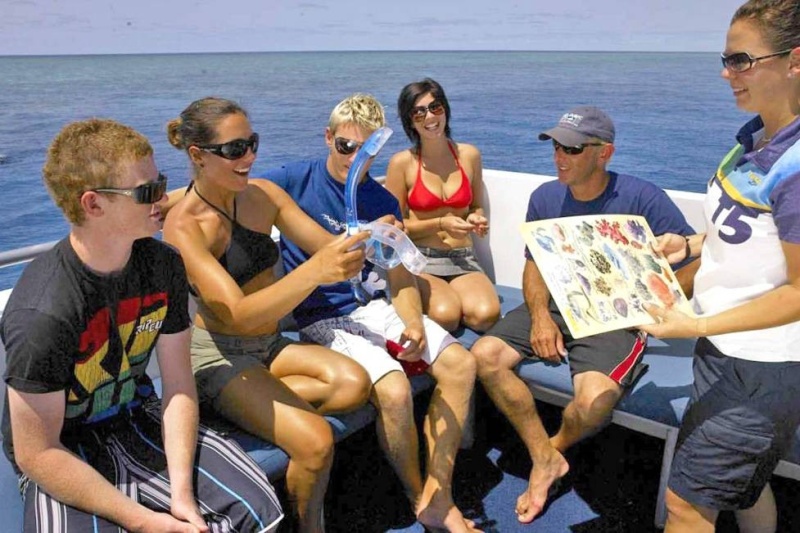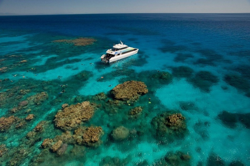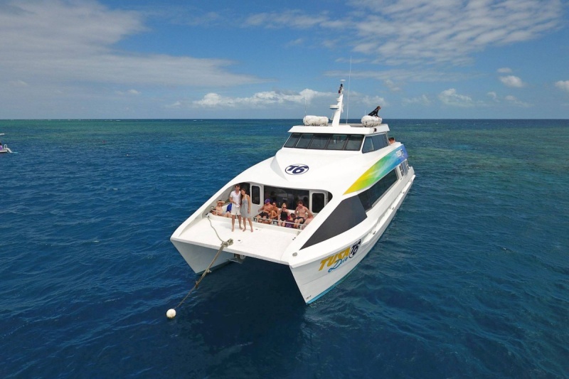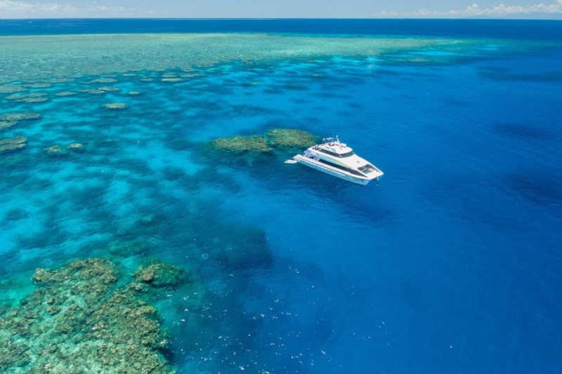 The vessel departs from A-Finger at Cairns Marina at 9am. During the journey to the outer reef, guests receive a briefing on the day's snorkelling activities and safety information from the crew.